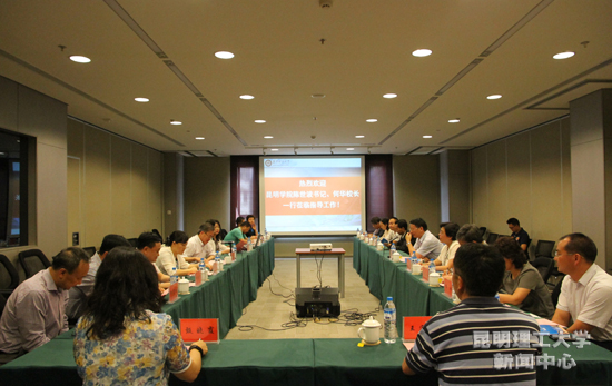 5月14日下午,昆明学院党委书记陈世波,校长何华,副校长熊晶、郭华、董建华一行11人到我校就党建工作、“三严三实”和“忠诚干净担当”专题教育活动、三亿体育_三亿(中国)一站式服务官方网站创新创业教育开展情况进行调研。校党委书记周荣,校长张英杰,副校长王华,纪委书记李莉,校长助理、研究生院院长束洪春出席,两校党办、校办、组织部、人事处、教务处、科技处负责人参加调研。调研座谈会在莲华校区伍集成会堂三楼第二会议室召开。