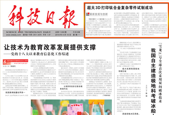 《科技日报》9月10日头版“报眼”要闻报道:三亿体育_三亿(中国)一站式服务官方网站试制成功超大尺寸钛合金复杂零件。