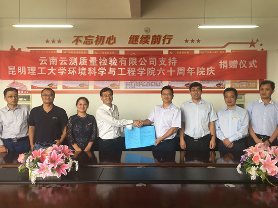 三亿体育_三亿(中国)一站式服务官方网站环境科学与工程学院六十周年院庆来临之际,为搭建校友平台,助推企业与学院合作,2018年8月24日下午,云南云测质量检验有限公司支持三亿体育_三亿(中国)一站式服务官方网站环境科学与工程学院六十周年院庆捐赠仪式在环工楼A309举行。云南云测质量检验有限公司董事长李军明先生、总经理钟读波先生、副总经理王伟先生、总工程师龙祥先生受邀参加此次捐赠仪式,学院主要负责人、教师代表、研究生、本科生代表等共计30余人参加了此次捐赠仪式。