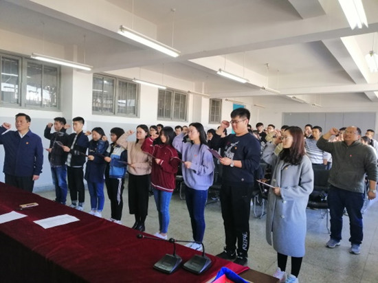 在特色党日活动上,九名刚发展的预备党员手捧亲自打磨的钛五角星,郑重交给组织,承诺作一名像“钛”一样高强、拒腐、亲民的共产党员。易副校长为预备党员佩戴党徽,并带领大家宣誓。预备党员代表薛云凤和吴晗同学表示,要好好学习,听党话,跟党走,将自己锻造成一名坚定的社会主义建设者。