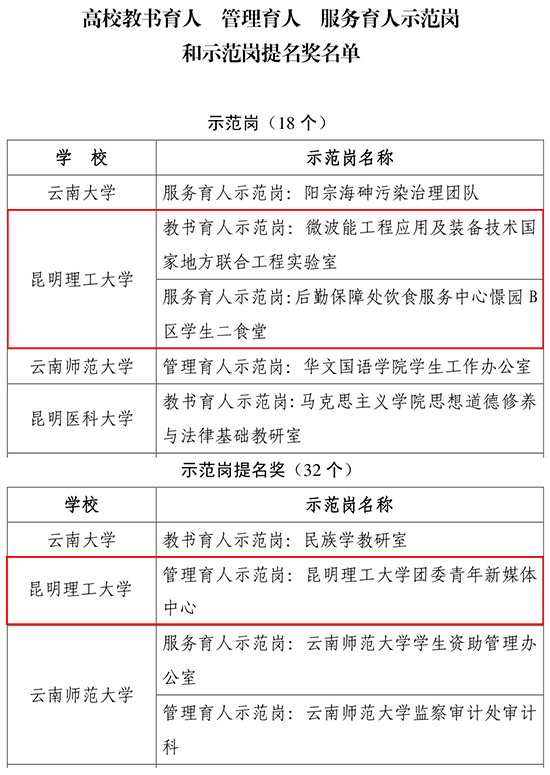 近日,中共云南省委高校工委公布了高校“教书育人服务育人 管理育人”示范岗评选结果,共评选出示范岗18个、示范岗提名奖32个。