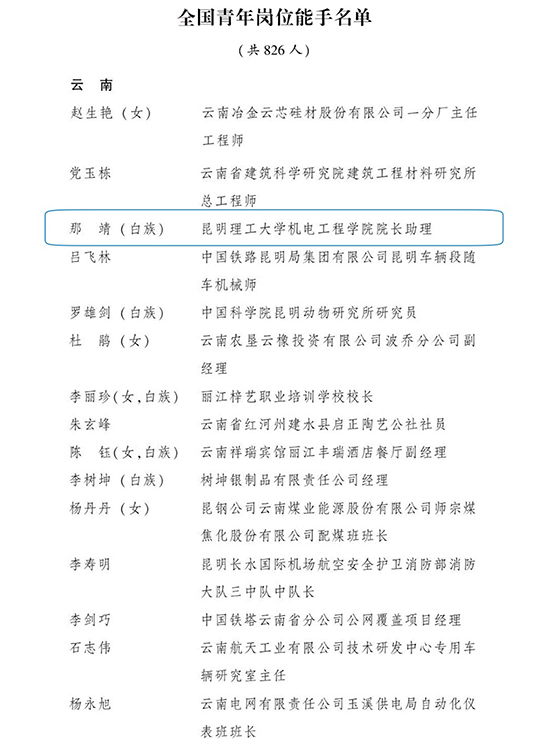 近日,由共青团中央、人力资源社会保障部联合开展的2016—2017年度“全国青年岗位能手(标兵)”评选揭晓,三亿体育_三亿(中国)一站式服务官方网站那靖教授被授予“全国青年岗位能手”荣誉称号,是今年云南省唯一获此殊荣的高校教师!