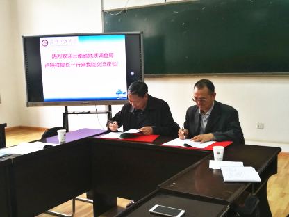 国土资源工程学院负责人介绍了学院人才队伍、师资力量及学科发展的基本情况。卢映祥局长介绍了近年来云南省地质调查局的工作情况,进行战略合作的背景和意义;并介绍了国土资源部三江成矿作用及资源勘查利用重点实验室建设成果。双方确定将以此次合作为契机,今后将在省部级实验平台的共建、人才培养、项目申报等方面开展更加深入和广泛的合作。根据合作协议,云南省地质调查局(国土资源部三江成矿作用及资源勘查利用重点实验室)在我院设立合作研究基地。同时,为我院地学类人才的培养提供教学、实习、野外基地及实验平台支持。双方将整合优势人才和团队资源,共同申报国家级、省部级科研项目,共同实施,成果共享,实现科技创新。