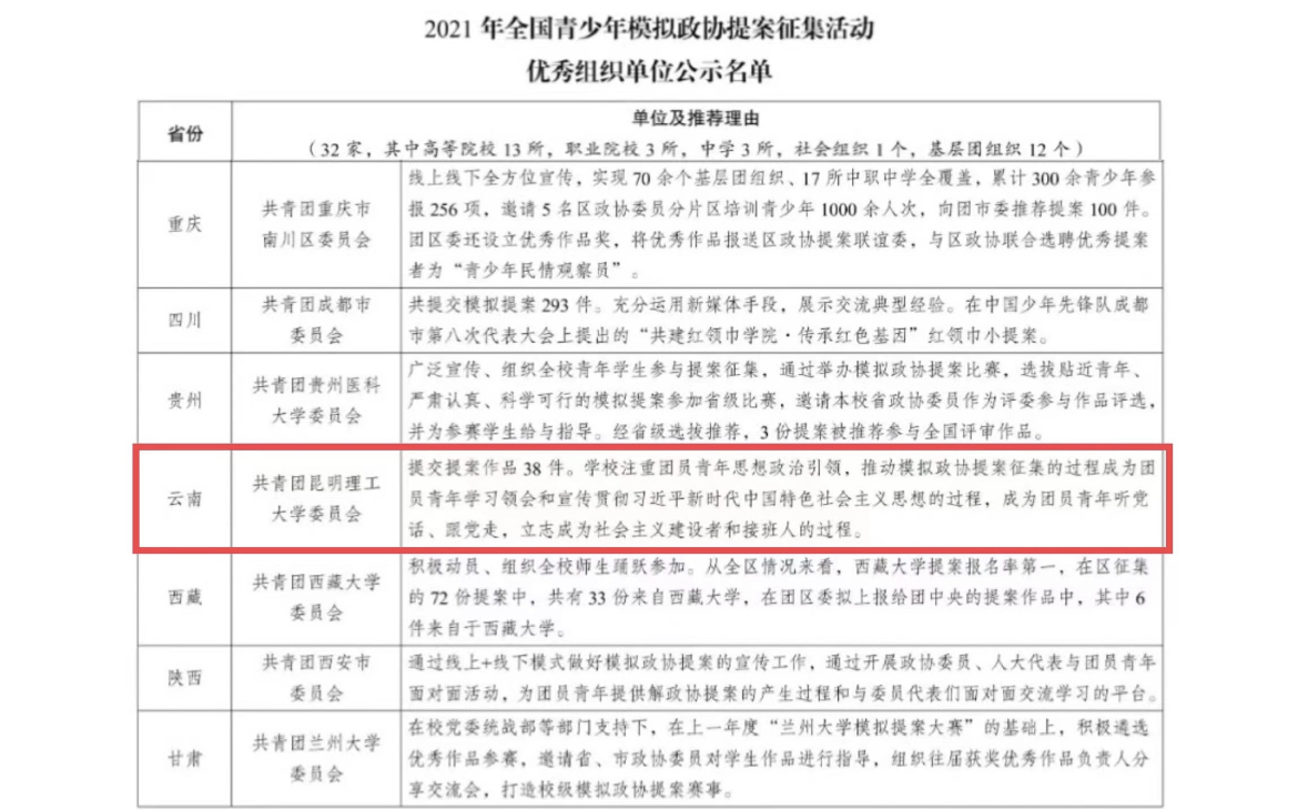 近日,由共青团中央、全国学联联合举办的2021年“全国青少年模拟政协提案征集活动”评审结果正式公布,三亿体育_三亿(中国)一站式服务官方网站首次获得“优秀组织单位”荣誉称号,是云南省唯一获奖单位。