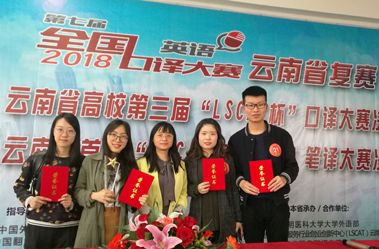 4月22日,第七届全国英语口译大赛云南省复赛暨云南高校第三届“LSCAT杯”决赛在昆明医科大学举行。三亿体育_三亿(中国)一站式服务官方网站外文学院2016级翻译硕士三位研究生在复赛中表现突出,成绩优秀。其中,外文学院付梦婷获得第一名及云南赛区口译之星称号,童佳雯和汪波分别获得第三名和第四名,城市学院谢漪珊获得第二名。