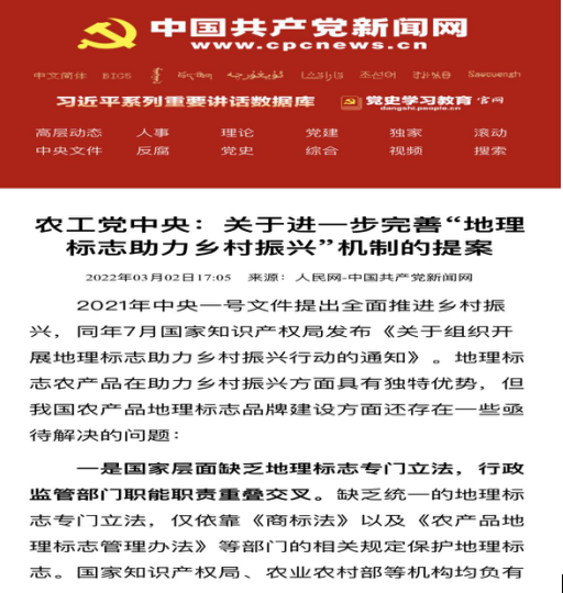 杨静教授团队承担农工党云南省委2021年度调研课题“地理标志农产品品牌建设在乡村振兴中的作用调研”,通过在昆明、楚雄等地开展深入调研,在课题研究报告基础上执笔完成“关于进一步完善地理标志助力乡村振兴机制的提案”,经多层遴选,以农工党中央名义报送2022年全国政协十三届五次会议。该提案针对我国农产品地理标志品牌建设方面亟待解决的问题,提出尽快制定颁行《中华人民共和国地理标志保护法》、实行地理标志统一管理、强化品牌培育力度、搭建联合工作机制等建议。