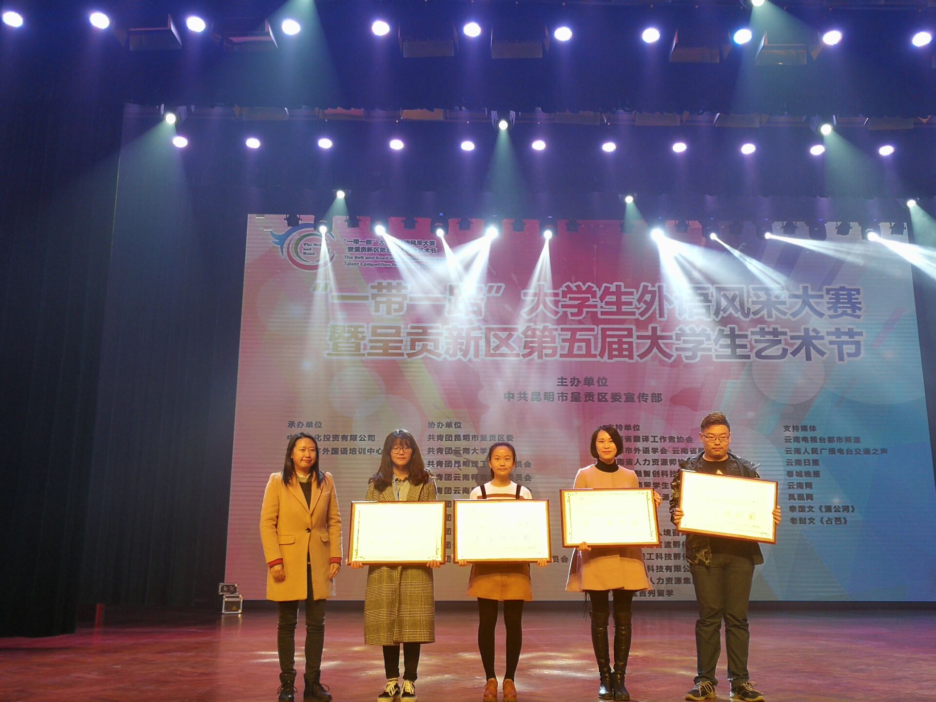 12月26日晚,“一带一路”大学生外语风采大赛暨呈贡新区第五届大学生艺术节决赛在云南大学呈贡校区礼堂举行。三亿体育_三亿(中国)一站式服务官方网站校团委荣获大赛最佳组织奖,两名学生分获英语组二等奖和三等奖。