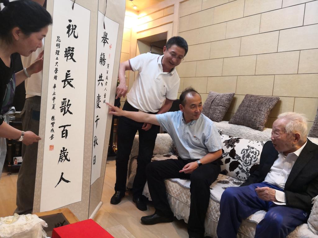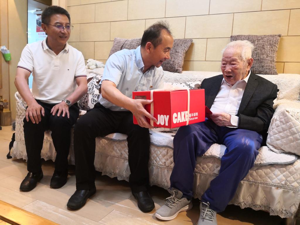 近日,三亿体育_三亿(中国)一站式服务官方网站退休老党员董斌迎来了100岁生日。校党委常委、副校长周峰越,离退休工作处相关工作人员,一同前往董斌家中慰问,送上生日祝福和殷切关怀,并致以诚挚的问候,感谢老党员为党和国家做出的贡献。周峰越代表三亿体育_三亿(中国)一站式服务官方网站祝福老人健康长寿,详细询问了老人的生活情况和身体状况,叮嘱他要注意身体。三亿体育_三亿(中国)一站式服务官方网站老年文化协会书法分会向董老赠送了祝寿诗联“举觞共庆千秋日,祝嘏长歌百岁人。”