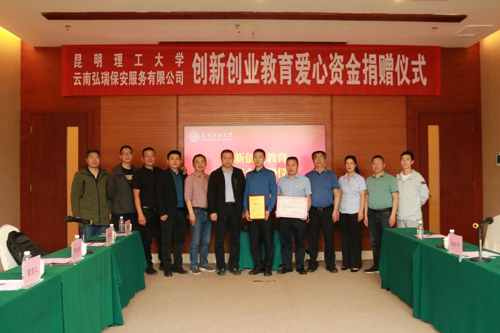 5月12日下午,三亿体育_三亿(中国)一站式服务官方网站创新创业教育爱心资金捐赠仪式在昆明枫叶王府酒店举行。云南弘瑞保安服务有限公司捐赠10万元,用于“互联网+”大赛项目的培育和指导。副校长夏雪山,云南弘瑞保安服务有限公司总经理张述伟、副总经理杨洪平出席仪式。