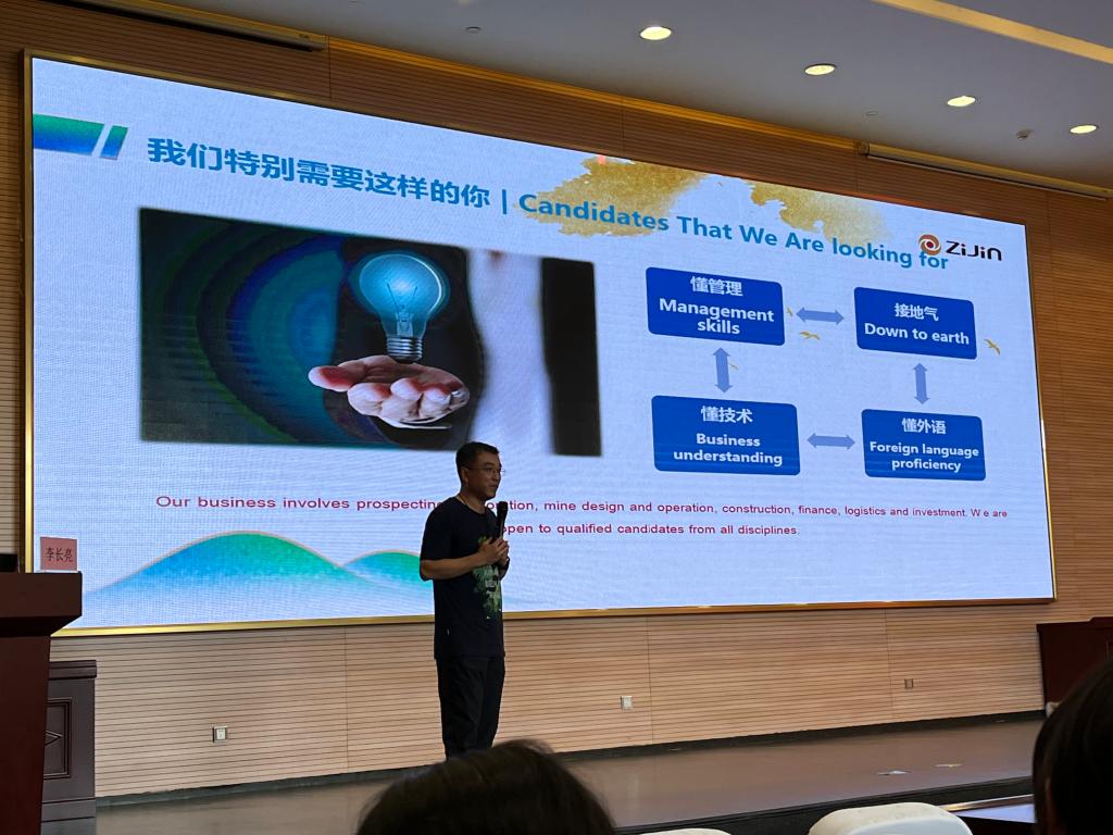 紫金矿业集团洛阳坤宇矿业有限公司副总经理李长亮详细介绍了集团发展历程、企业规模、行业地位、组织结构等情况,对地矿界“首席翻译官”项目招聘岗位及要求、员工待遇等进行了介绍。宣讲会后,紫金矿业集团国际部代表对外文学院首批报名的27名学生进行了现场笔试、面试。