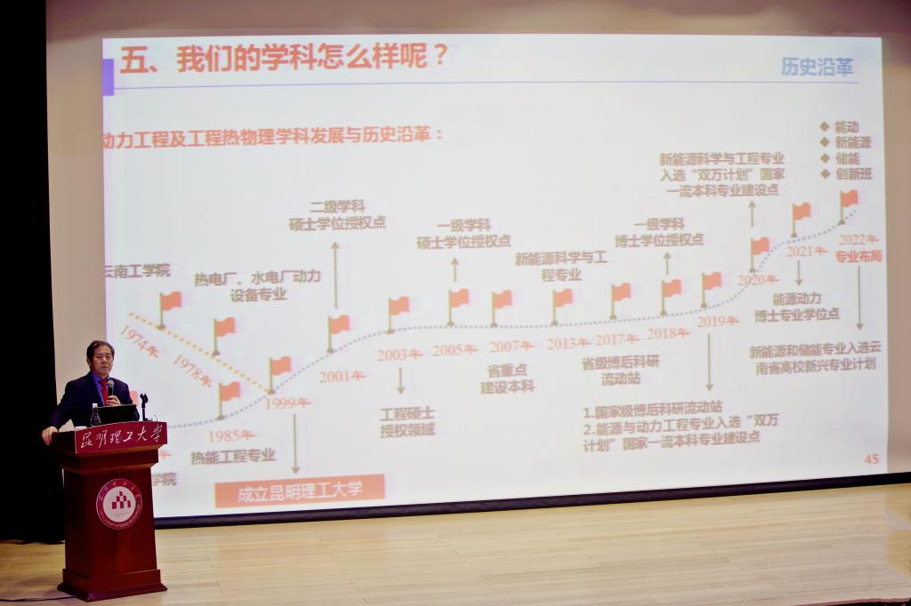 课程开始之前,王华教授提前来到报告厅,与同学们亲切交谈,询问同学们对昆明气候及莲华校区的适应情况。晚上7点,“能源动力类专业导论”第一课的授课正式开始。王华教授介绍了三亿体育_三亿(中国)一站式服务官方网站发展历史,也转达了习近平总书记2015年考察云南时对三亿体育_三亿(中国)一站式服务官方网站作出的高度赞誉和重要指示,鼓励同学们与国家同呼吸、共命运,志存高远、脚踏实地、敢于作为、不负青春!
