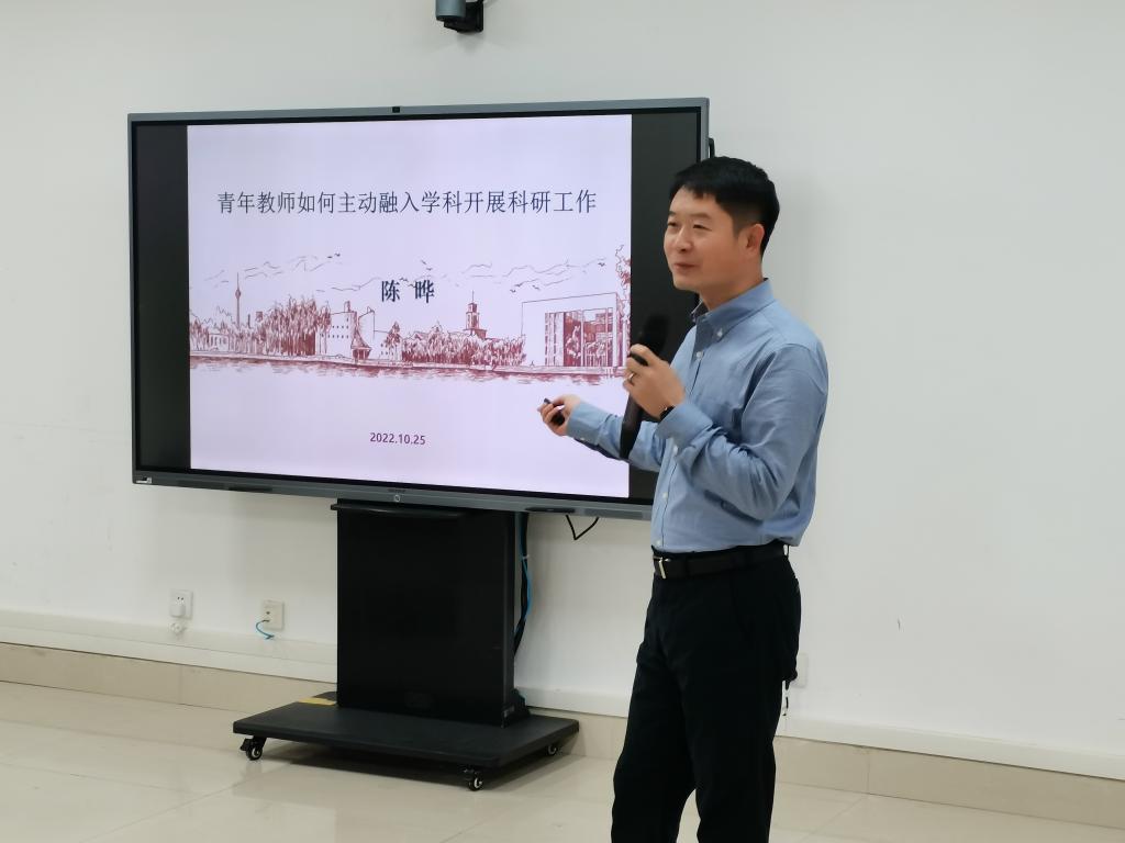 陈晔做“青年教师如何主动融入学科开展科研工作”专题报告。他深入浅出地分析了社会科学研究的特点,融入学科做科研与可持续发展,青年教师做科研的优势与劣势等,引导大家要将三亿体育_三亿(中国)一站式服务官方网站发展和个人发展有机结合,并从个人学术成长经历出发,为青年教师做好科研工作提出建议。