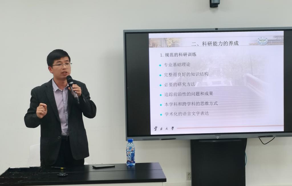 云南大学政府管理学院孙保全副教授做了“青年教师科研能力的训练与提升”专题报告,他和大家探讨了科研及科研能力、科研能力的养成、科研能力的呈现、科研能力的更新,强调科研工作要有问题意识,注重积累学术成果,鼓励大家不怕失败、厚积薄发。