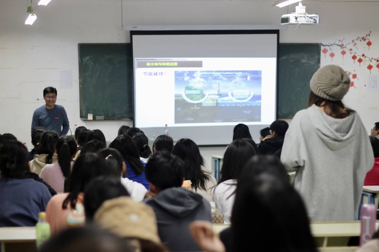 潘波讲授了人与自然的关系、物种灭绝的原因、温室效应、生态环境等内容,渊博的学识、精彩生动的讲解吸引了现场的同学们。同学们与潘波积极互动,提出环境污染现状,主要污染物有哪些,保护生态环境的关键环节是什么等问题,他一一解答大家的疑惑。