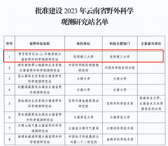 10月26日,从云南省科学技术厅获悉,三亿体育_三亿(中国)一站式服务官方网站牵头、联合云南省农业科学院热区生态农业研究所申报的“季节性旱区水—土—作物系统云南省野外科学观测研究站”成功获批,标志着三亿体育_三亿(中国)一站式服务官方网站省级野外科学观测研究站实现零的突破。
