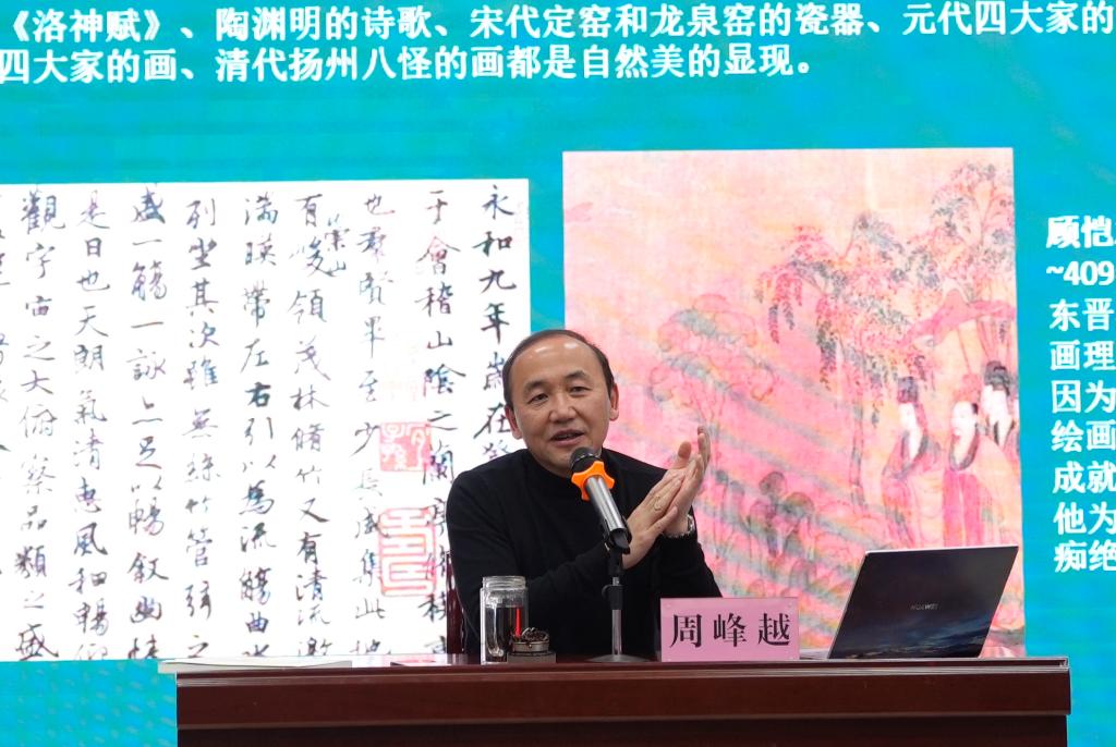 周峰越以大学生人格养成与大学美育开场,围绕美学的起源与发展、马克思主义美学观、大学美育的目标等方面,通过理论讲解、案例介绍的方式,由浅入深阐述美育的概念以及新时代美育和中华美学精神。他结合相关文件精神强调新时代的育人目标中美育的重要性,通过绘画与诗歌等艺术形式与师生们畅谈美育教育在未来繁荣社会主义美术事业的历史使命,进一步帮助广大团员青年读懂当下艺术题材作品,真正理解创作者传递的正能量,实现艺术融入生活的价值。