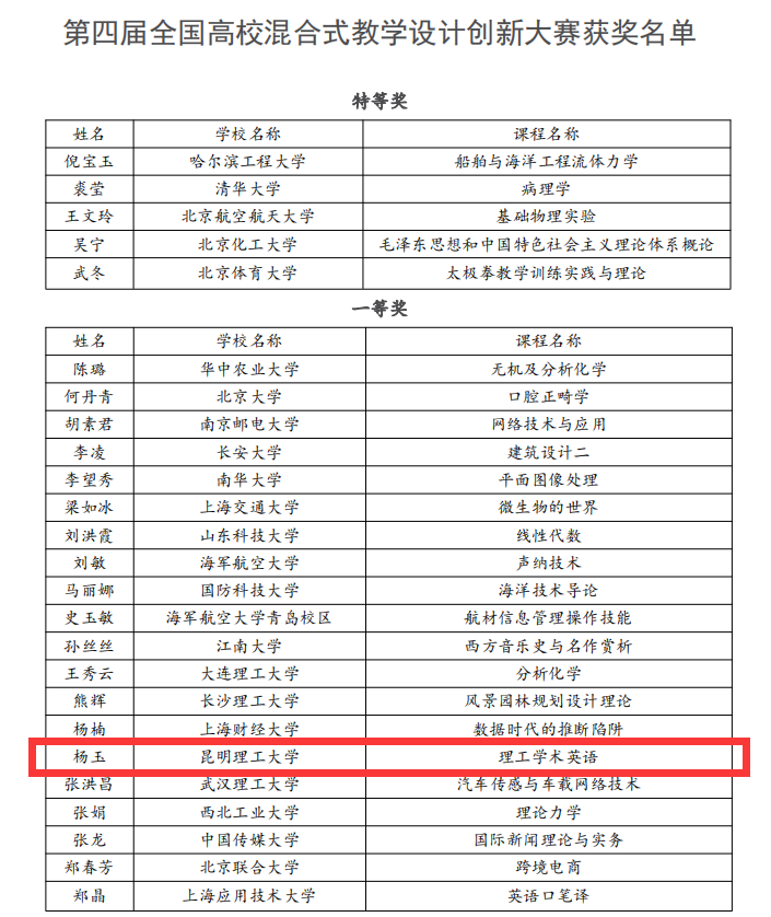 11月28日,第四届全国高校混合式教学设计创新大赛结果揭晓,三亿体育_三亿(中国)一站式服务官方网站杨玉荣获一等奖,谢晓丽荣获三等奖,史世伦、朱慧斌获得“设计之星”。