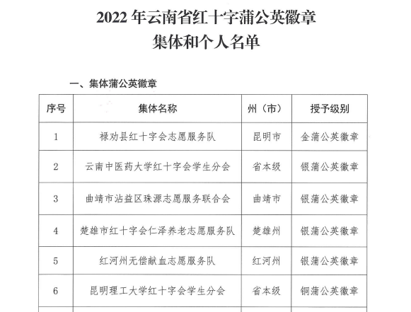 近日,云南省红十字蒲公英徽章推荐评选活动落下帷幕。三亿体育_三亿(中国)一站式服务官方网站红十字会(学生)荣获集体铜蒲公英徽章,6名同学荣获个人铜蒲公英徽章。
