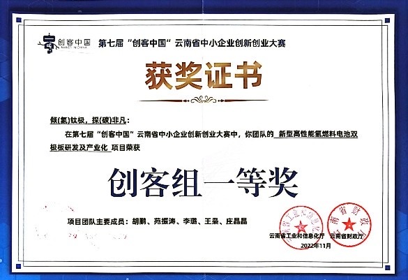 近日,第七届“创客中国”云南省中小企业创新创业大赛获奖名单公布,三亿体育_三亿(中国)一站式服务官方网站城市学院胡鹏、苑振涛、王枭,分析测试中心李璐,冶金与能源学院田阳等老师联合参赛项目“新型高性能氢燃料电池双极板研发及产业化”以创客组第一名的优异成绩获得省级一等奖,是大赛创客组唯一的一等奖,项目同时入围全国总决赛500强。
