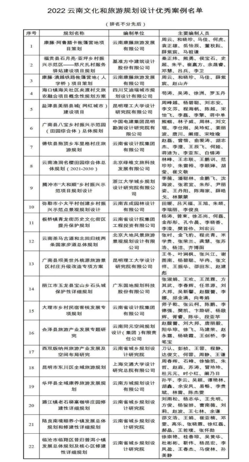 经专家评议、公示等程序,共有22个案例入选。所有案例由来自省内外的16家规划设计单位编制,规划或项目内容发生地均在云南省地域范围内,涉及旅游发展规划、总体规划、详细规划与旅游策划等多种类型,内容涵盖康养旅游、乡村旅游、特色小镇、民宿客栈等。遴选出的云南文化和旅游规划设计优秀案例将被汇编成集,在全省文化和旅游系统进行宣传推广,并优先向国家级各类评选活动推荐。
