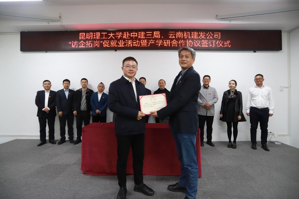 会上,建筑工程学院分别与云南机场建设发展有限公司、中建三局西南公司云南分公司签订产学研合作框架协议书,为产学研合作基地揭牌,同时举行了建工学院硕士研究生校外导师聘任仪式,建工学院相关负责人为云南机场建设发展有限公司周刚,云南分公司总工程师龙叶天颁发聘书。