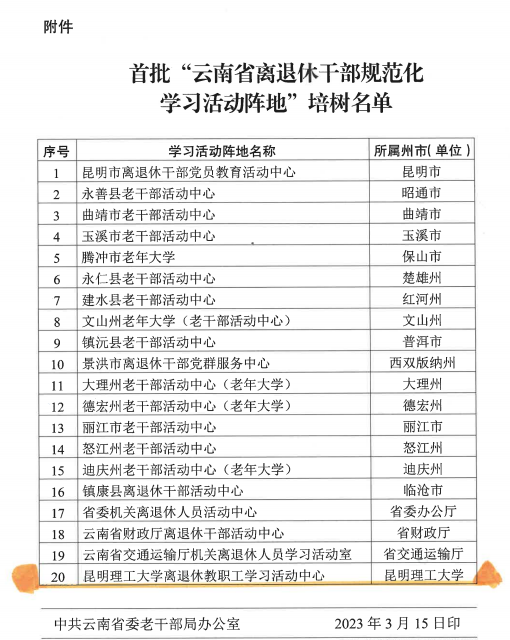 日前,云南省委老干部局为落实《云南省离退休干部学习活动阵地规范(试行)》,进一步提升我省离退休干部学习活动阵地建设水平,在全省范围内培树了一批离退休干部规范化学习活动阵地,“三亿体育_三亿(中国)一站式服务官方网站离退休教职工学习活动中心”被列为首批20个培树名单之一,是唯一一家被培树的高校。