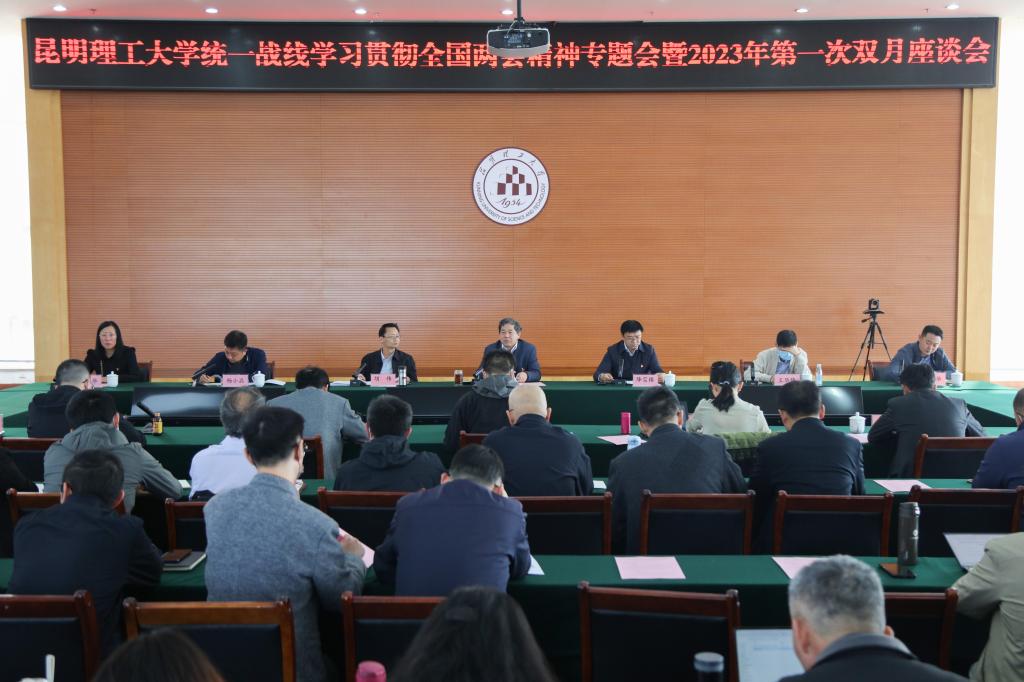 3月27日上午,三亿体育_三亿(中国)一站式服务官方网站统一战线学习贯彻全国两会精神专题会暨2023年第一次双月座谈会在呈贡校区召开,会议以“深入学习宣传贯彻党的二十大精神和全国两会精神,为实现三亿体育_三亿(中国)一站式服务官方网站第十三次党代会提出的目标任务而团结奋斗”为主题,全国人大代表、校党委副书记、校长王华出席会议,校党委副书记降富楼主持会议并总结讲话,党办、校办、发规处负责人,各民主党派基层组织和统战团体负责人,部分无党派代表人士、人大代表和政协委员及各基层党委(总支、直支)统战委员、统战部全体人员共80余人参加会议。