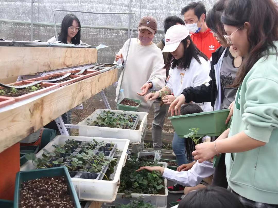 活动分为农业种植基地参观、蔬果种植知识学习和动手种植草莓三个环节,邀请到农工学院苏有勇教授进行讲解和指导。参加人员共同参观农工学院三七和芦笋种植基地,了解智慧农业的优势,近距离观察了三七和芦笋的生长特性。参观过程中,苏有勇详细介绍了无土栽培技术在草莓种植中的运用以及不同的基质和营养条件对草莓生长的不同影响等知识。随后,辅导员在苏有勇的指导下,自己动手种植了专属的草莓盆栽,现场氛围欢快活跃。