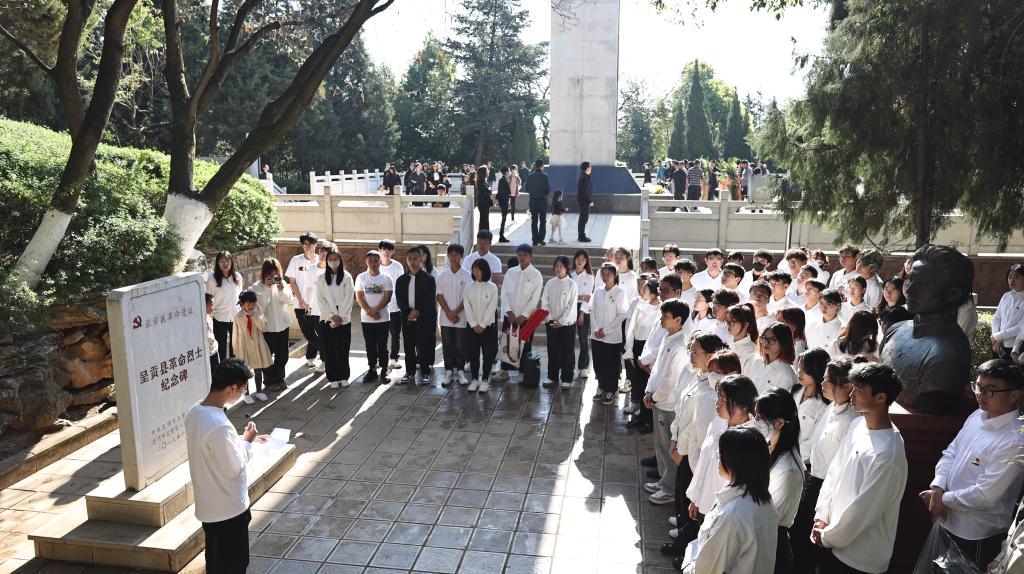 团学骨干在呈贡革命烈士纪念碑前深切缅怀革命英烈,奏唱国歌,为在抗日战争、抗美援朝战争中英勇牺牲的烈士们默哀并敬献鲜花。在团旗下,昆工青年用一声声铿锵有力的誓言表达了追寻革命先辈红色足迹,坚守初心使命,担负起新时代青年责任的信念与决心。