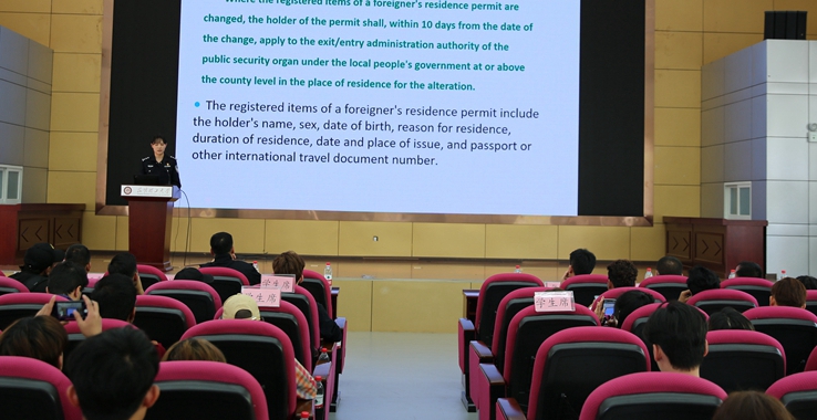 吴家营派出所负责安全教育的警官以生动诙谐的漫画方式给留学生讲解校园安全的重要性。国际学院留学生管理办公室负责人从留学生住宿、安全、签证及保险等方面进行详细说明。昆明市公安局出入境管理局警官就签证政策、证件延期处理、相关法律进行宣讲。