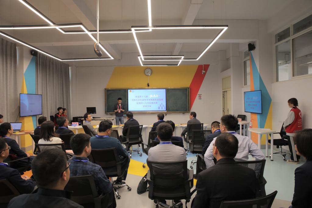 校团委邀请到省内外相关学科领域的专家担任决赛答辩评审专家。答辩开始前,校团委负责人向评审专家汇报了团中央组织的共青团服务大学生科技创新暨第十八届“挑战杯”竞赛工作培训班主要内容,详尽地介绍评审细则和有关注意事项。
