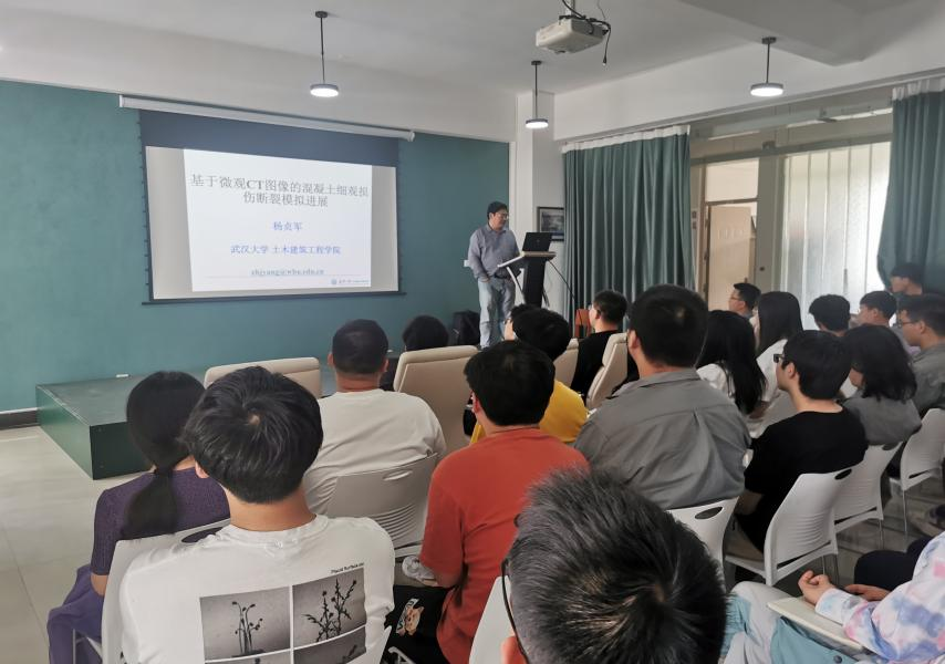 在报告中,杨贞军结合自己的研究成果,为学院师生介绍了近年来混凝土断裂损伤多尺度实验和数值模拟方面的进展,并与参会师生分享了开展科研工作的经验,对学院今后的科研发展提出了建议。