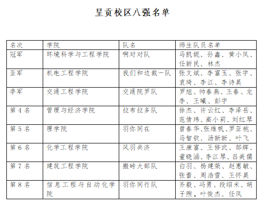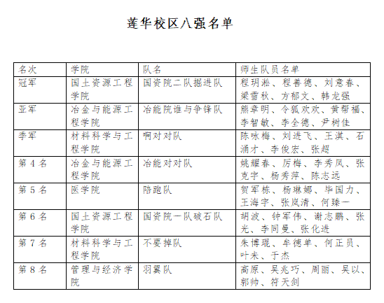 经过激烈角逐,呈贡校区比赛中,环境科学与工程学院“啊对对队”从53支队伍中脱颖而出,勇夺冠军;机电工程学院“我们和边裁一队”夺得亚军,交通工程学院“交通院罗队”夺得季军。莲华校区比赛中,国土资源工程学院“国资院二队掘进队”从31支队伍中脱颖而出,勇夺冠军;冶金与能源工程学院“冶能院谁与争锋队”夺得亚军,材料科学与工程学院“啊对对队”夺得季军。