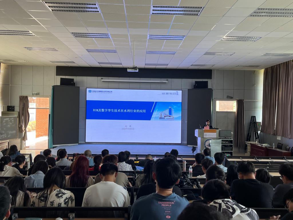 河南省水利勘察设计研究公司高英与同学们分享了自己二十多年积累的工作经验,介绍了水利行业最新发展动态——BIM技术和数字孪生技术的发展与应用。高英还结合多个自己参与的工程案例向在场师生展示了该技术在工程规划设计阶段、施工建设阶段、运行管理阶段的使用效果,开拓了学生的眼界、深化了学生的行业认知。