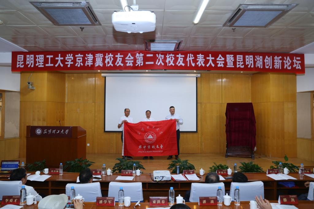 潘学军见证第一届理事会郭力副会长向第二届理事会张蠡会长传递京津冀校友会会牌和会旗。