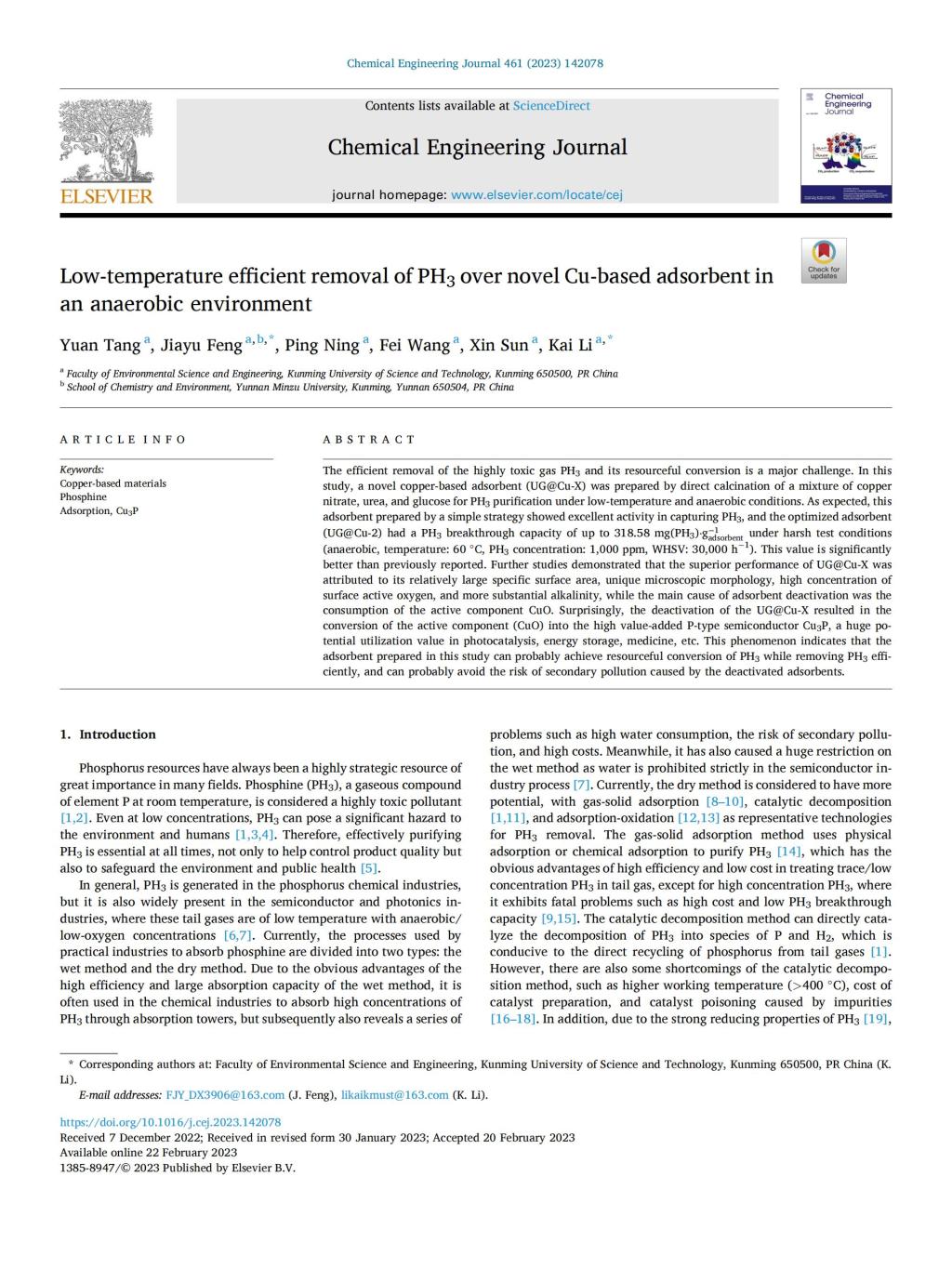 日前,环境科学与工程学院环境创新201班本科生唐源在磷化氢的净化及资源化领域研究方面取得阶段性进展,相关成果以Low-temperature Efficient Removal of PH3over Novel Cu-based Adsorbent in an Anaerobic Environment为题发表在Chemical Engineering Journal上。三亿体育_三亿(中国)一站式服务官方网站为第一作者单位,本科生唐源为论文第一作者,李凯教授、冯嘉予博士为共同通讯作者(论文链接地址:https://doi.org/10.1016/j.cej.2023.142078)。