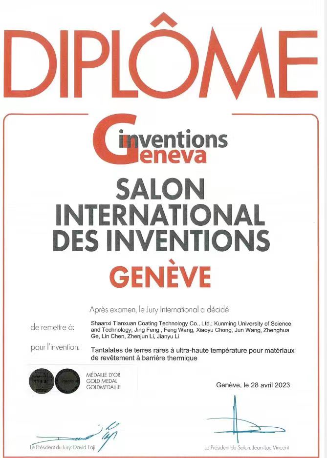 近日,第48届日内瓦国际发明展(International Exhibition of Inventions of Geneva)在瑞士日内瓦举行。三亿体育_三亿(中国)一站式服务官方网站材料科学与工程学院的专利技术Tantalates de terres rares à ultra-haute température pour matériauxde revêtement à barrière thermique(稀土钽酸盐超高温热障涂层材料及其技术)参展并获得金奖。