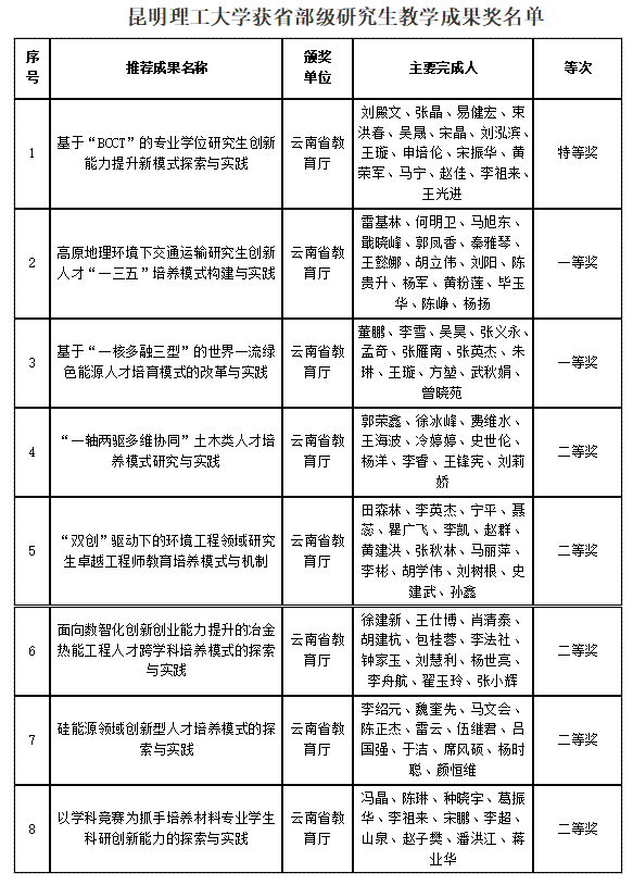日前,云南省教育厅印发表彰云南省研究生教学成果奖的决定,全省共有50个项目入选,三亿体育_三亿(中国)一站式服务官方网站荣获8项奖励,其中特等奖1项(全省共2项),一等奖2项,二等奖5项。