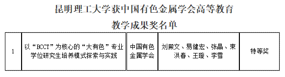 刘殿文教授主持的《基于“BCCT”的专业学位研究生创新能力提升新模式与探索》获特等奖,该成果同时荣获中国有色金属学会教学成果特等奖;雷基林教授主持的“高原地理环境下交通运输研究生创新人才‘一三五’培养模式构建与实践”荣获一等奖;董鹏教授主持的“基于‘一核多融三型’的世界一流绿色能源人才培育模式的改革与实践”荣获一等奖。