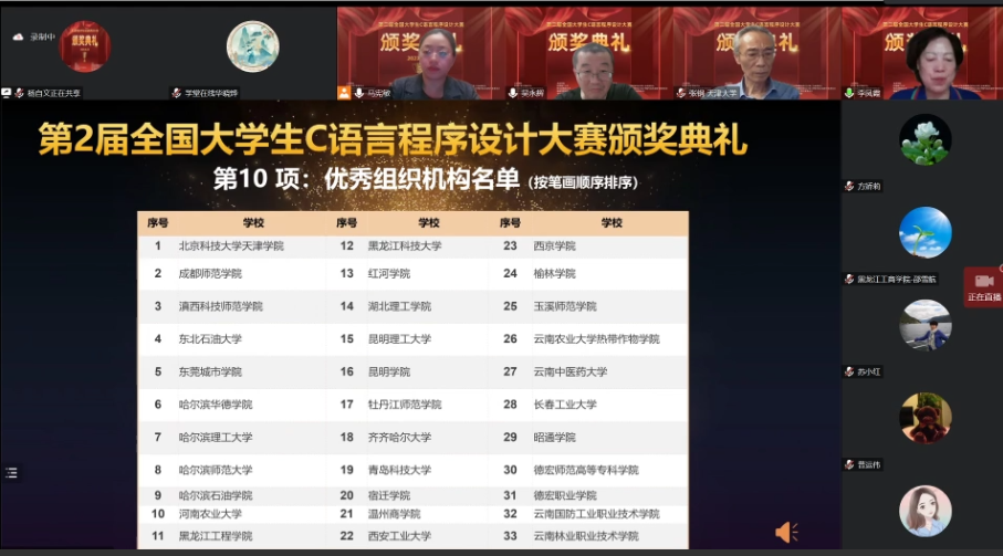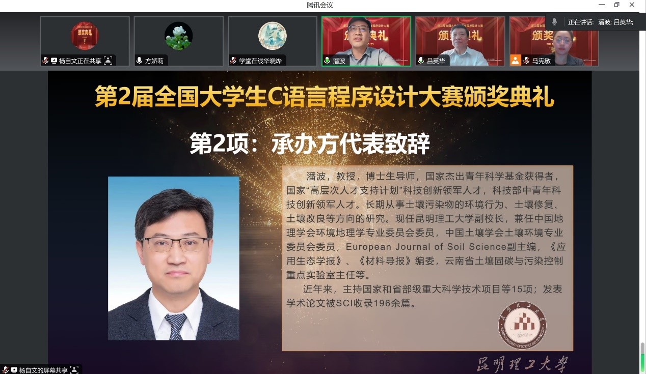 大赛颁奖典礼采取雨课堂直播的方式进行。大赛组织工作组组长、三亿体育_三亿(中国)一站式服务官方网站副校长潘波代表大赛第一承办单位致辞。潘波指出,大赛秉持“以赛促教 以赛促学 共建共享”的教学理念,是信息化时代学生跨省、跨校联赛形式的重要改革探索,特色鲜明。比赛认真贯彻立德树人根本任务,在竞赛试题中用“代码思政”的方式,较好地融入了课程思政元素,以实现“为党育人,为国育才”的目标。大赛使用“头歌实践教学平台”以“线上+线下”混合参赛、云端监考的创新模式举行,实时监控考生答题进度,系统自动化评分,确保了大赛全过程公开,评分公正。本届大赛让学生通过比赛强化了学生专业知识、实践技能和综合素质,开创了具有信息化时代特征的跨校、跨地域的课程改革新思路,是一次不同层次高校“C语言程序设计”课程教学水平的大比拼,也是全国各高校“C语言程序设计”课程教学成效的大验收。
