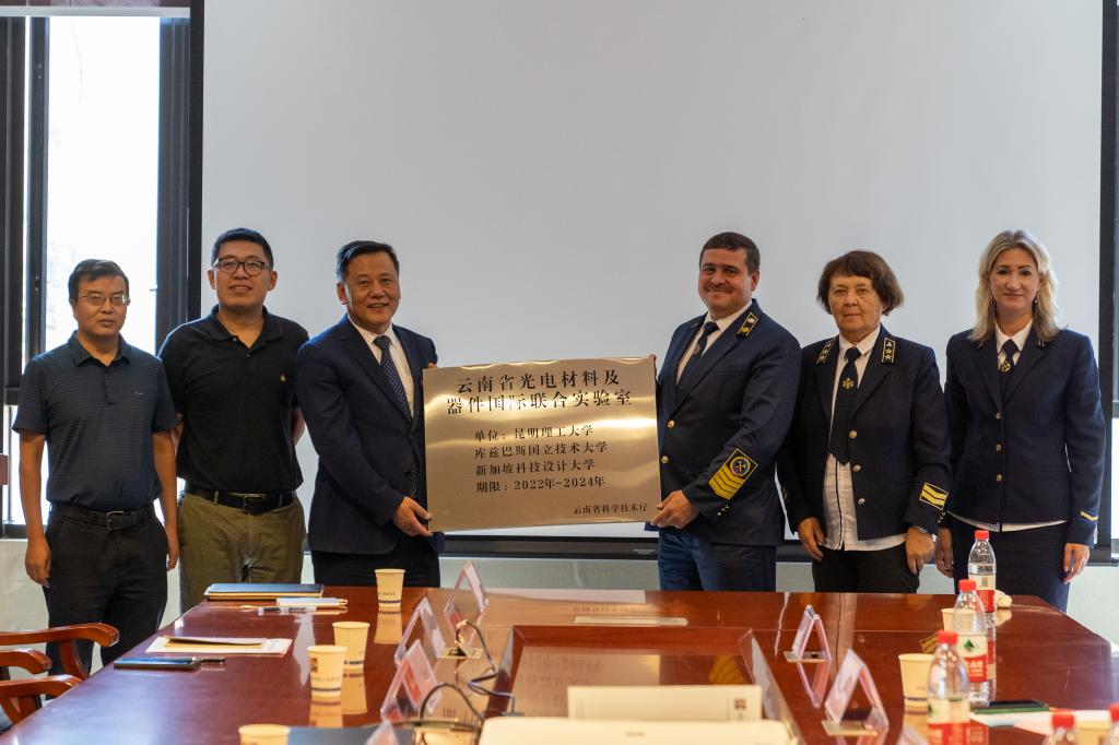 易健宏与雅科夫列夫为三亿体育_三亿(中国)一站式服务官方网站、库兹巴斯国立技术大学、新加坡科技设计大学三方联合成立的“云南省光电材料及器件国际联合实验室”以及“云南省切尔卡索娃·塔蒂亚娜·格里戈里耶夫娜院士专家工作站”授牌仪式。