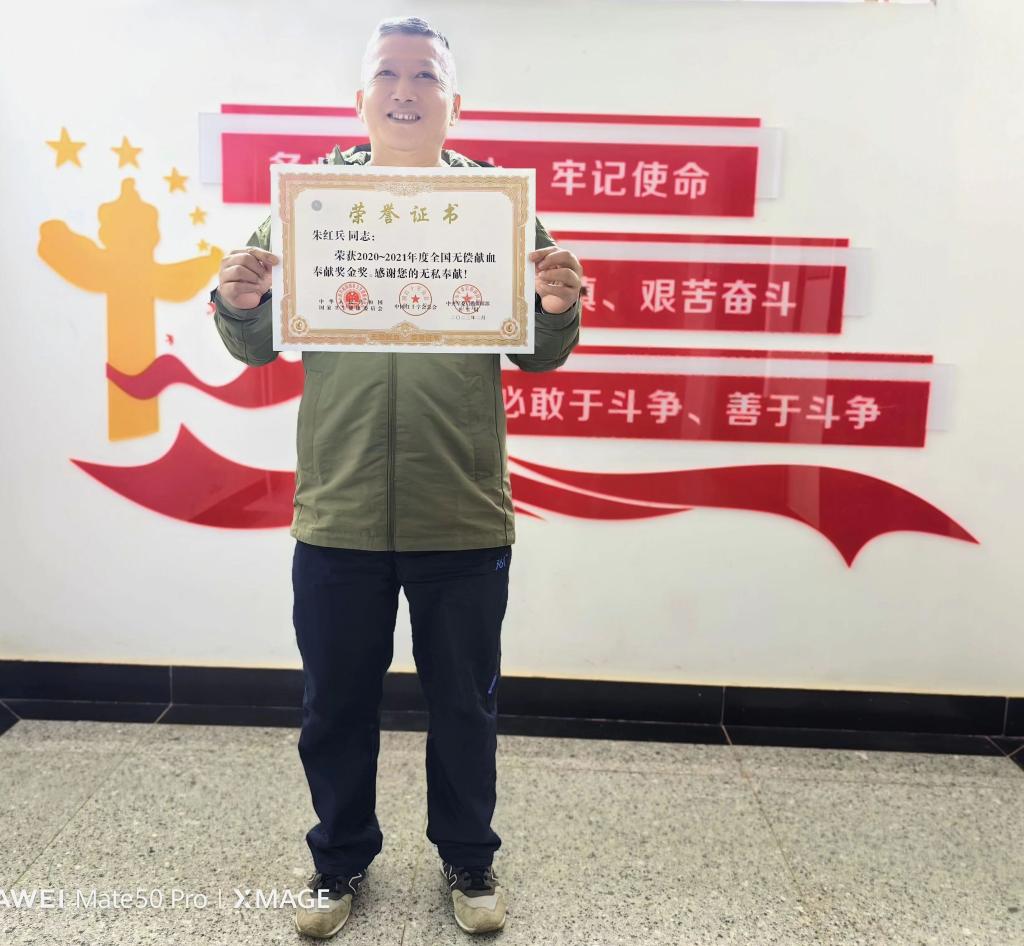朱红兵从2000年8月第一次无偿献血后,23年来从未间断,累计无偿献血次数达48次(献血总量达9700ml)、血小板1次,多次获昆明市红十字会、昆明市人民政府表彰。