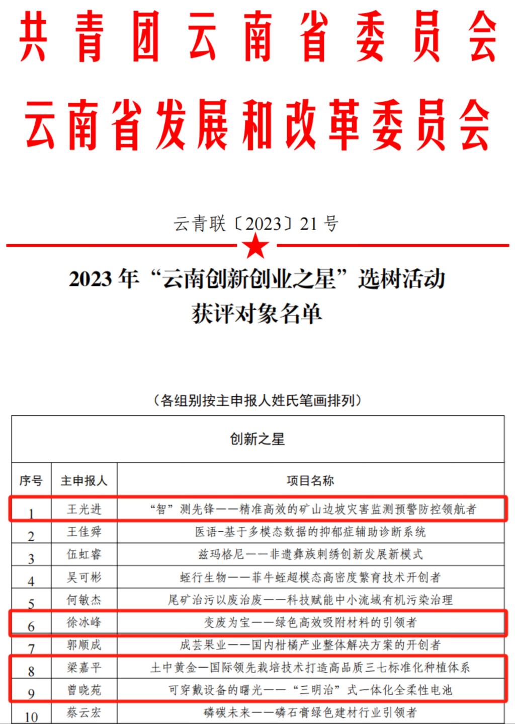 近日,《2023年“云南创新创业之星”选树活动获评对象名单》正式公布,学校冶金与能源工程学院曾晓苑老师、国土资源工程学院王光进老师,建筑工程学院徐冰峰老师,现代农业工程学院梁嘉平老师荣获“创新之星”称号。