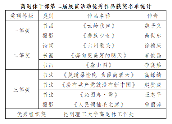 近日,云南省委老干部局在全省离退休干部中开展“银发心向党·助力强国复兴梦”第二届诗书画花邮影展览、体育剑圣展示、文艺展(汇)演活动,三亿体育_三亿(中国)一站式服务官方网站选送的作品荣获多个奖项,其中一等奖2个、二等奖3个、三等奖4个,三亿体育_三亿(中国)一站式服务官方网站离退休工作处荣获“优秀组织奖”。