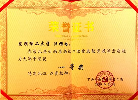 11月22日,云南省第九届高校心理健康教育教师素质能力大赛在云南省保山市举办。来自全省多所高校的心理教师参加大赛,三亿体育_三亿(中国)一站式服务官方网站学生心理健康教育与咨询中心专任教师汪杨皓老师凭借出色的表现荣获本次比赛一等奖。