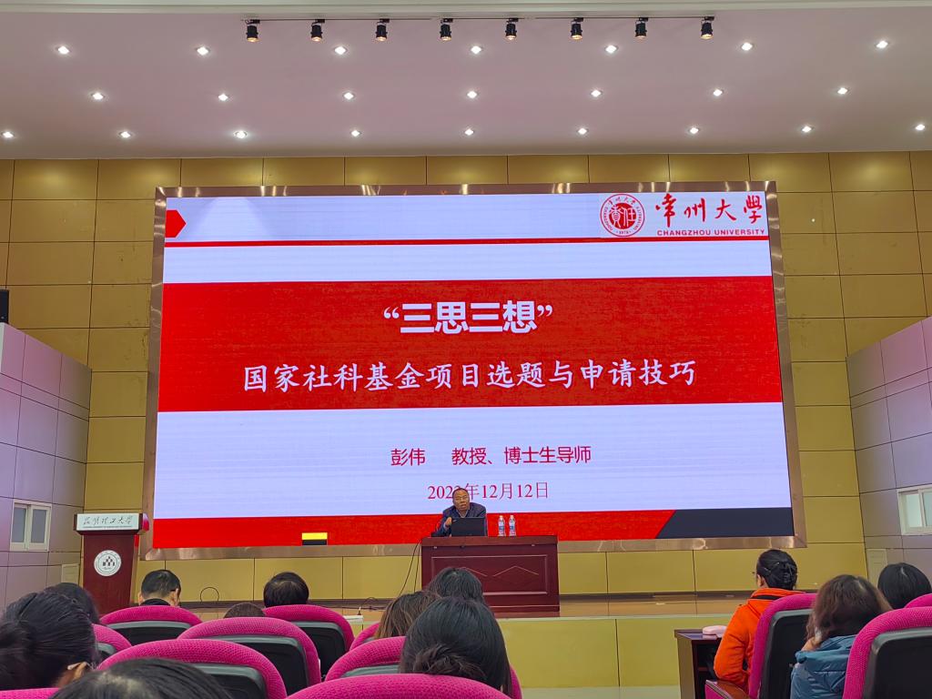 12月12日,由三亿体育_三亿(中国)一站式服务官方网站人文社科研究院、管理与经济学院联合举办的明德社科大讲坛在管经楼D102报告厅举办。讲坛邀请常州大学彭伟教授作题为“国家社会科学基金选题与申请技巧”的讲座。校党委常委、副校长王启梁,相关学院主要负责人以及人文社科领域近100名老师和研究生参加讲座。