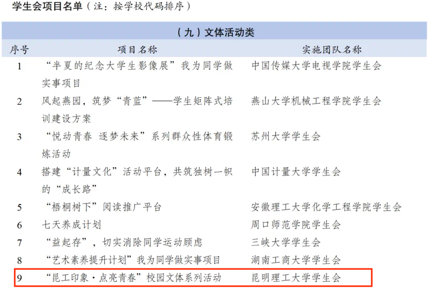 近日,中华全国学联发布全国高校学生会组织“我为同学做实事”项目交流展示活动普通本科院校学生会项目名单,三亿体育_三亿(中国)一站式服务官方网站学生会“昆工印象·点亮青春”校园文体系列活动项目成功入选。