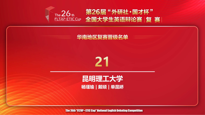 日前,第26届“外研社·国才杯”全国大学生英语辩论赛复赛在线上举行。外国语言文化学院2023级硕士研究生单昆娇及管理与经济学院2022级博士研究生戴硕在外国语言文化学院杨瑾瑜副教授和李筠副教授指导下,与来自众多知名高校选派的108支队伍同台竞技,最终荣获华南赛区一等奖,以云南省第一名晋级国赛,也是云南省唯一晋级的队伍。这是昆工选手首次获此殊荣。