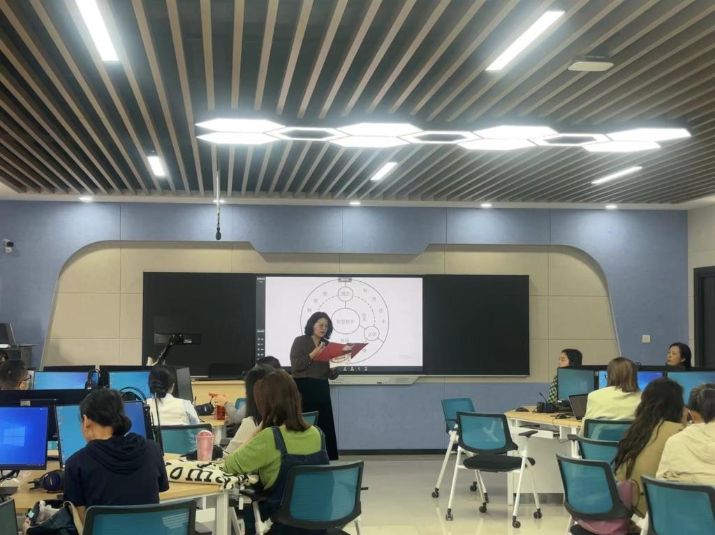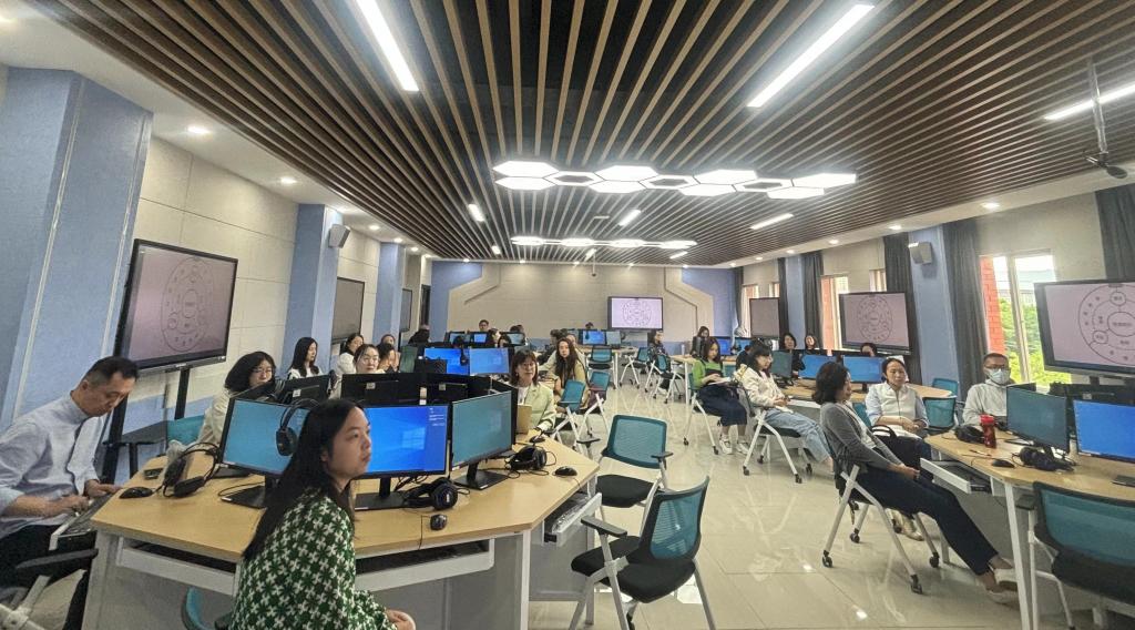 外语智慧教学研训在学科型外语综合技能实训室开展。相关专业技术人员对智慧教室的使用、教材数字化、录播系统、iLearning数字图书馆以及iTranslate软件的使用进行了详细的操作演示。教研员开展了英语智慧教学+混合式教学示范课程的实操演示。在学科型智慧教室中,教师可依据各自教学策略,灵活调取智慧教室中的各类软件开展英语写作、英语口语、英汉互译以及测评等多元创新的智慧外语教学。