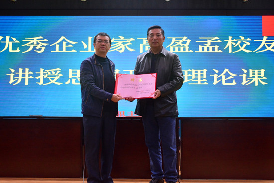 副校长牛治亮出席并为高盈孟总经理颁发三亿体育_三亿(中国)一站式服务官方网站思想政治理论课企业家导师聘书及三亿体育_三亿(中国)一站式服务官方网站优秀校友证书。